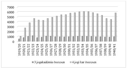 Míg a dualizmus időszakában az egyetemi- és jogakadémiai joghallgatóknak az egyes quinqenniumokban mért aránya 70 %-ról - igaz ingadozóan - az I. világháború végére 30 % körülire apadt, s az országvesztés okán tovább csökkent, a '30-as években ismét a felsőoktatásban tanuló hallgatók több mint 45 %-át tette ki. Egy nem túlságosan hízelgő megközelítés szerint "A [jogi] terület súlya ugyan folyamatosan csökkent az időszak alatt, de a hallgatók többsége ezen a területen tanult. Ennek oka az volt, hogy a társadalomban magas volt a jogi végzettség presztízse, és legtöbbször alacsony színvonalon folyt a képzés, ami miatt könnyű volt a jogászdiploma megszerzése."[28] Természetesen ennél sokkal összetettebb okok álltak a jogi kari tanulmányok népszerűsége mögött, amelyeket Nagy Zsolt kiválóan összegez.[29]