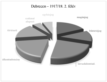 A két világháború között körülbelül 20-25 különböző főkollégiumi tárgyat hallgattak a diákok a jogi karokon. A debreceni tanrendek a '10-'20-as évekre azt mutatják,[40] hogy valóban erős volt a társadalomtudomány körébe sorolható tárgyak és az államtudományi ismeretek aránya (hozzávetőleg 23, illetve 20 %). A magánjogi és büntetőjogi ismeretek együtt sem tették ki a főkollégiumok óraszámának 1/3-át (18, illetve 12 %). A történeti és szakmai alapozó tárgyak aránya viszonylag mérsékelt volt (16, illetve 5 %). Ehhez társult még az egyházjog, mintegy 6%-os részesedéssel.[41]