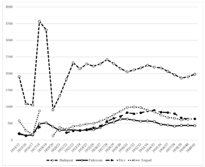 Alábbi táblázat négy kiválasztott naptári évben mutatja, hogy míg a vidéki karok jó esetben legfeljebb annyi nyilvános rendes tanárt alkalmaztak (tudtak alkalmazni), ahány főtantárgy-csoportot oktatni kellett (10-13 professzor), addig a kezdeti budapesti professzorbőség is elapadt a '30-as évek végére,[47] igaz itt a viszonylag bőséges rendkívüli- és magántanári testület jelentősen enyhített az abból fakadó feszültségeken, amelyek az előadások megtartása és a vizsgák kivétele tekintetében jelentkezhettek.