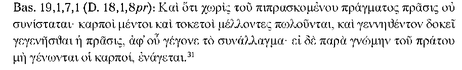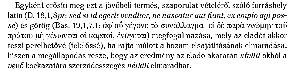 [31] Innentől kezdve a görög citátumhoz tartozó lábjegyzetben Heimbach latin fordítását közlöm. Itt: Item sine re, quae venditur, venditio non contrahitur: fructus tamen et partus futuri recte venduntur, et his editis venditio facta videtur, ex quo contractus initus est: sed si propter venditoris voluntatem non fiant fructus, convenitur.
