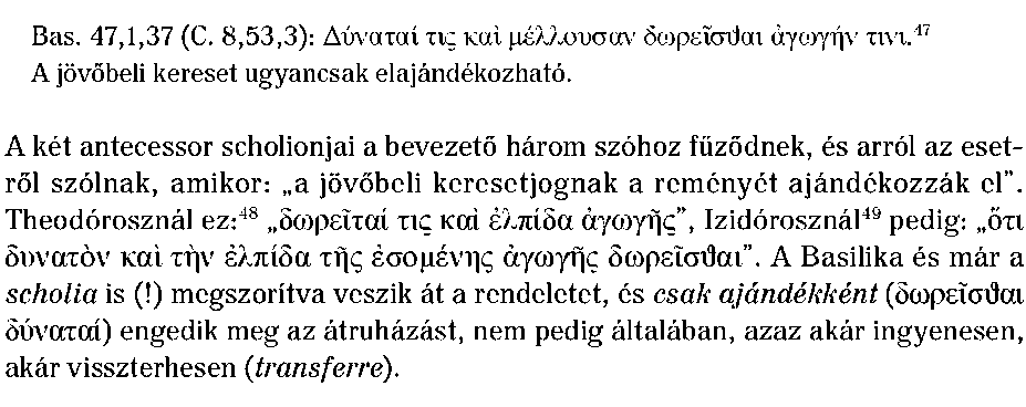 Decius császár (249-251) 250. évi rendelete (C. 8,53,3[43]) szerint az ajándékba kapott, jövőbeli keresetjog ingyenes és visszterhes átruházása (transferre) az ajándékozó teljes beleegyező nyilatkozatával (plena intercedente donatoris voluntate) megengedett. A Basilika mellőzi a remény szót, jóllehet a két fontos antecessor, Theodórosz és Izidórosz Basilika szerkesztői által ismert[44] iratai a római császári rendelethez hasonlóan tárgyesetben (spem = έλπίδα) tartalmazták a remény szót.
