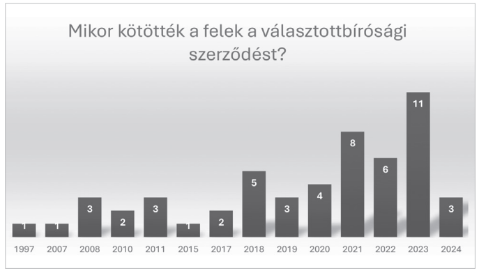 Ugyanígy vizsgáljuk, hogy mely évben kötötték meg a felek a választottbírósági szerződésüket. Minden évben érkezik olyan ügy, amelyben a szerződő felek között a szerződés megkötése után hosszú évek elteltével alakul ki jogvita (általában társasági, bérleti, kölcsönszerződések esetén fordul ez elő), a vizsgált ügyek közül a legrégebbi választottbírósági szerződést 1997-ben kötötték.