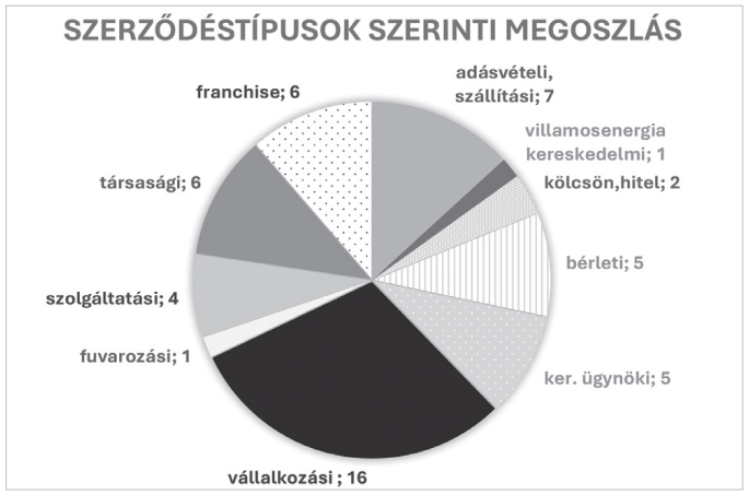 2024-ben az alapul fekvő szerződések aránya is jelentősen változott. Csökkent a bérleti, a kölcsön- és hitelszerződések aránya és nőtt a vállalkozási szerződések aránya. A 2024-ben beérkezett ügyek között a vállalkozási szerződések dominálnak (ismét), az összes eset közel felét teszik ki. Az adásvételi, franchise, társasági, bérleti és kereskedelmi ügynöki szerződések, amelyek viszonylag kiegyensúlyozott arányban fordulnak elő. A kölcsön/hitel és fuvarozási szerződések viszonylag marginális szerepet játszanak.