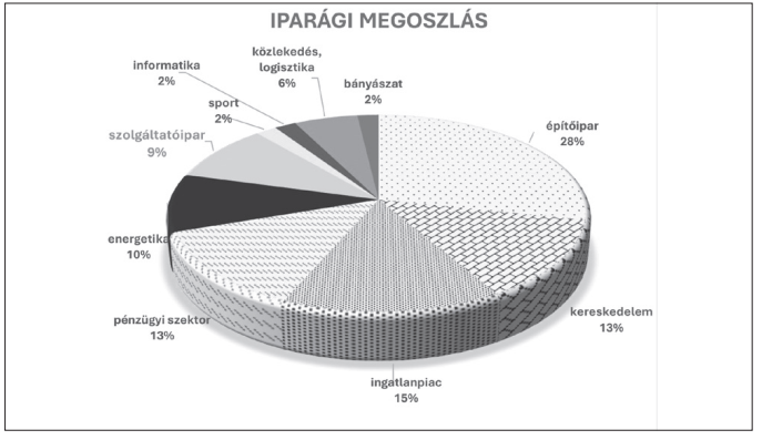 Ahogy a szerződések típusából is látható, az építőipari cégek aránya kiemelkedik, a teljes eloszlás több mint negyedét (28%) teszi ki. Ez arra utal, hogy az adott gazdasági környezetben a választottbíróságot "használó", építőipari tevékenységet folytató cégek jelentős súllyal bírnak - például beruházások, infrastruktúrafejlesztések vagy lakásépítések révén. Jelentős az ingatlanpiaci, kereskedelmi cégek és a pénzügyi szektor aránya. Ezek a szektorok szorosan kapcsolódnak az építőiparhoz, például ingatlanfejlesztések, finanszírozás, illetve az épített környezet hasznosítása révén. Évről évre egyre nagyobb számban jelentkeznek ügyek az energetika és szolgáltatóipar területéről, míg a közlekedés, logisztika, informatika alacsony súllyal szerepel a választottbíróság gyakorlatában. Érdekesség, hogy 2024-ben a sport és a bányászat területéről is érkezett egy-egy ügy.