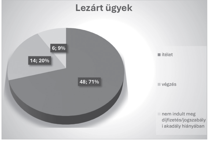2024-ben 68 ügy zárult le, ezek közül az egyik közvetítői eljárásként zajlott. A választottbírósági peres ügyek közül 48 ítélettel, 13 végzéssel zárult, és 6 benyújtott