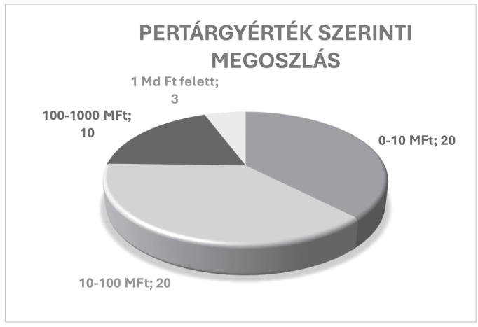 2024-ben a Magyar Kereskedelmi és Iparkamara mellett működő Állandó Választottbíróságon (a továbbiakban: Kereskedelmi Választottbíróság) az előző évihez képest jelentősen csökkent a beérkezett ügyek száma, 53 ügy indult. A pertárgyérték-adatokból kitűnik, hogy a 10 millió forint alatti ügyek száma csökkent, míg a magasabb pertárgyértékű ügyek száma növekedett. 2024-ben a legalacsonyabb pertárgyérték 100 ezer forint alatt volt, a legmagasabb pedig meghaladta a 2,5 milliárd forintot.