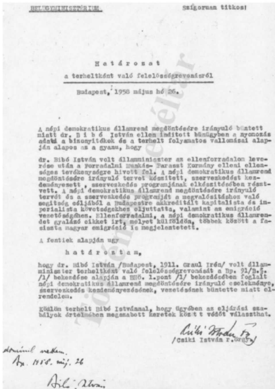 [27] Legfelsőbb Bíróság TÜK T. Nb. 42/1958/10. A Magyar Népköztársaság Legfelsőbb Bírósága népbírósági tanácsának ítélete dr. Bibó István és két társa büntetőügyében, 1958. augusztus 2. 1-2