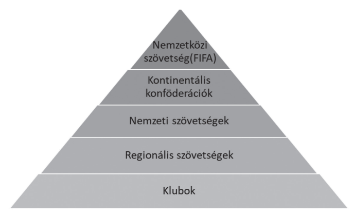 A piramis legalsó rétegét a klubok alkotják, amelyek nélkülözhetetlen elemekként jelennek meg, ezek nélkül nem tudna összeállni a labdarúgás rendszere. A klubokat eredetileg helyi közösségként alapították, időközben ez a rendszer azóta megváltozott, de továbbra is jelentős szerepük van a közösségekkel való kapcsolat miatt. A következő szintet a regionális szövetségek alkotják, amelynek tevékenységi körei általában egy adott régióra korlátozódnak, de még a nemzeti szövetségen belül működnek. A nemzeti szövetségek legfőbb feladata a nemzeti csapat koordinálása, továbbá a sportág legfőbb szabályozó és fegyelmi testületi feladatkörének ellátása az országhatárokon belül. Korlátozott autonómiával rendelkezik, hiszen fontos feladata, hogy be kell tartania a felette elhelyezkedő irányító szövetségek szabályait. Fontos kiemelni, hogy a FIFA országonként csak egy hivatalos szövetséget ismer el. A piramis következő szintjét a hat kontinentális konföderáció alkotja: az Ázsiai Labdarúgó-szövetség (AFC), az Afrikai Labdarúgó-szövetség (CAF), az Észak- és Közép-amerikai, Karibi Labdarúgó-szövetségek Konföderációja (CONCACAF), a Dél-amerikai Labdarúgó-szövetség (CONMEBOL), az Óceániai Labdarúgó szövetség (OFC) és nem utolsósorban az Európai Labdarúgó-szövetség (UEFA). A piramis legfelső szintjén a nemzetközi szövetség helyezkedik el, a Nemzetközi Labdarugó Szövetség (FIFA) amely a labdarúgás legfelsőbb hatósága, a világ labdarúgásának irányító központjaként funkcionál.[5]