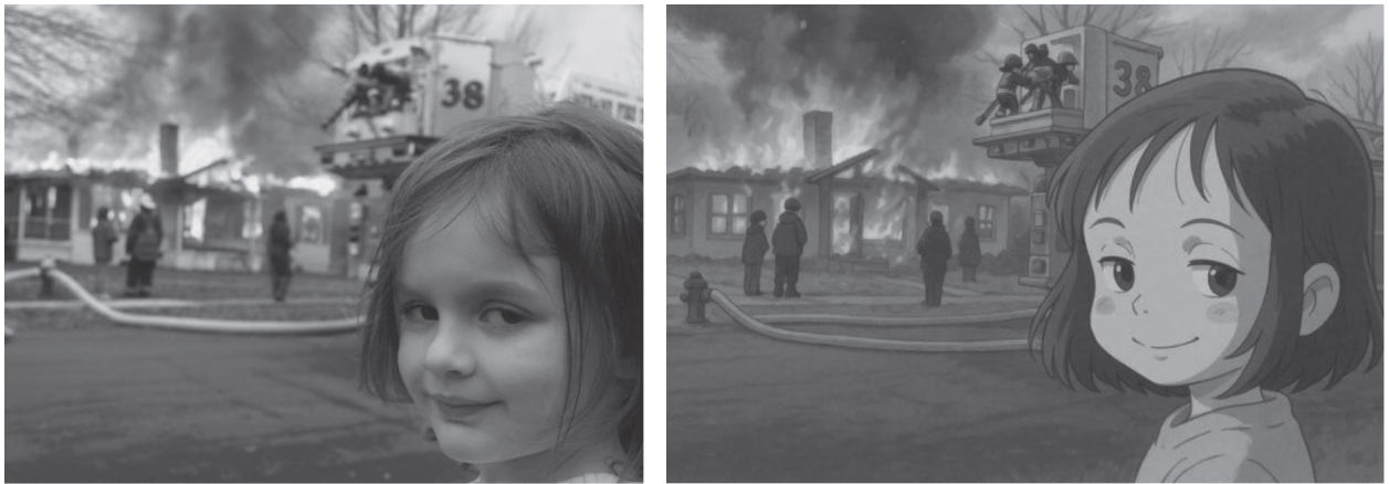 1. ábra A katasztrófalány (Disaster Girl) mém (balra) és az átdolgozott, "ghiblifikált" verzió (jobbra)