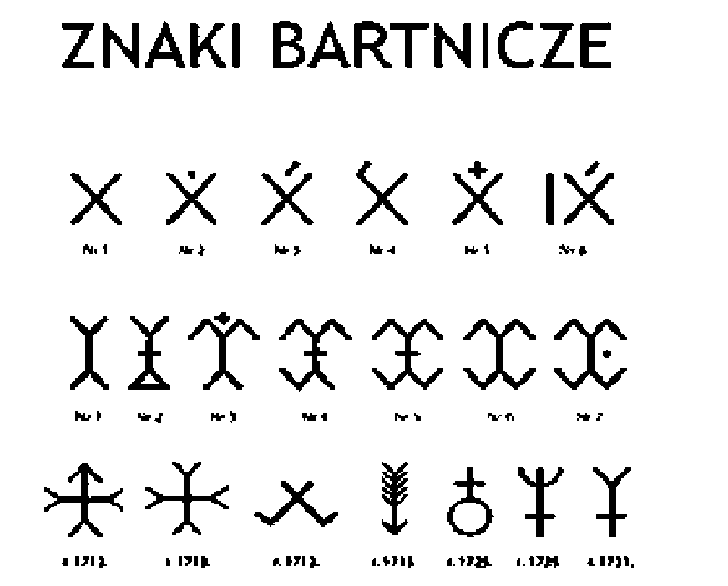In case of a conflict, the mark was being cut out of the tree and examined for its depth based on the tree rings. The symbols were mainly lines or combinations of lines, mostly crosses and their variants: Latin, St Andrew's, slanted etc., and circles and their combinations. Far less common were numerals (e.g. Latin), letters such as "C", "D" and even knight's crests like Osmoróg coat of arms.[38] The owners of the beehives were most often men, though of course, less often, also women.[39] As an example, in 1507, Marek Pieczonka from the village of Rudno bequeathed bee hives to his daughter Dorota.