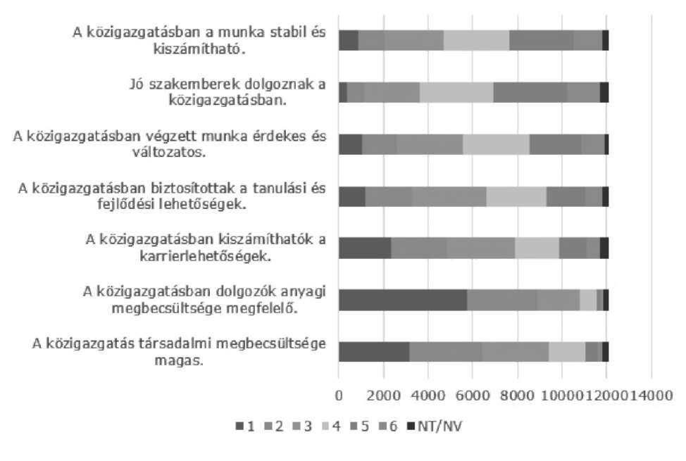 A legmagasabb átlagértékelést a "közigazgatásban a munka stabil és kiszámítható" állítás kapta, ami arra utal, hogy a válaszadók ezt az aspektust viszonylag pozitívan ítélik meg. A többség 5-ös vagy 6-os osztályzatot adott. A "Jó szakemberek dolgoznak a közigazgatásban" állítást is viszonylag kedvezően ítélték meg, de kevesebben értékelték teljesen pozitívra (5 vagy 6), mint a stabilitást. A "közigazgatásban végzett munka érdekes és változatos" értékelése megosztottabb, a válaszadók körében viszonylag sokan közepes vagy alacsony pontszámot adtak (2-4). A "közigazgatásban biztosítottak a tanulási és fejlődési lehetőségek" értékelése vegyes, ami arra utal, hogy ezen a területen van javítanivaló, szintúgy a "közigazgatásban kiszámíthatók a karrierlehetőségek" inkább közepes értékelést kapott, sok válaszadó alacsonyabb pontszámot adott.